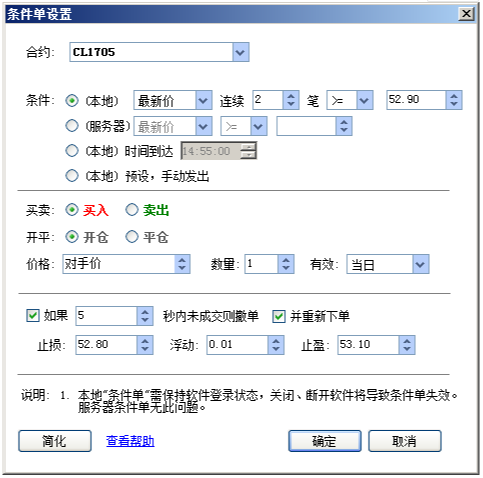 上图条件单含义:当CL1705的最新价连续2笔大于等于52.90时,以对手价买入开仓1手合约。开仓成功后,自动为持仓添加止损价52.80,浮动0.01,止盈价53.10,发出委托后如果5秒内未成交则撤单并重新下单,条件单当日有效。
